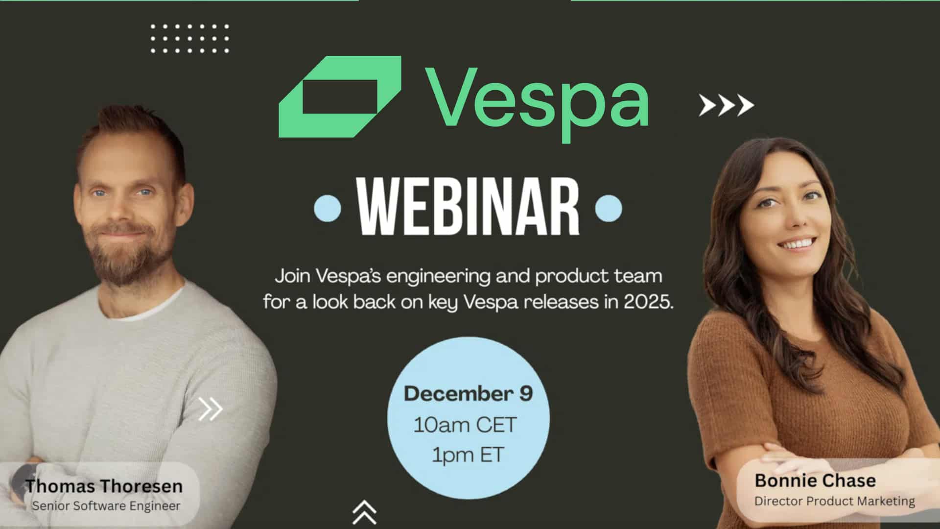 We’re passionate about sharing knowledge and connecting with the Vespa community. Explore our upcoming webinars and live events to learn, engage, and exchange ideas with peers and experts.
